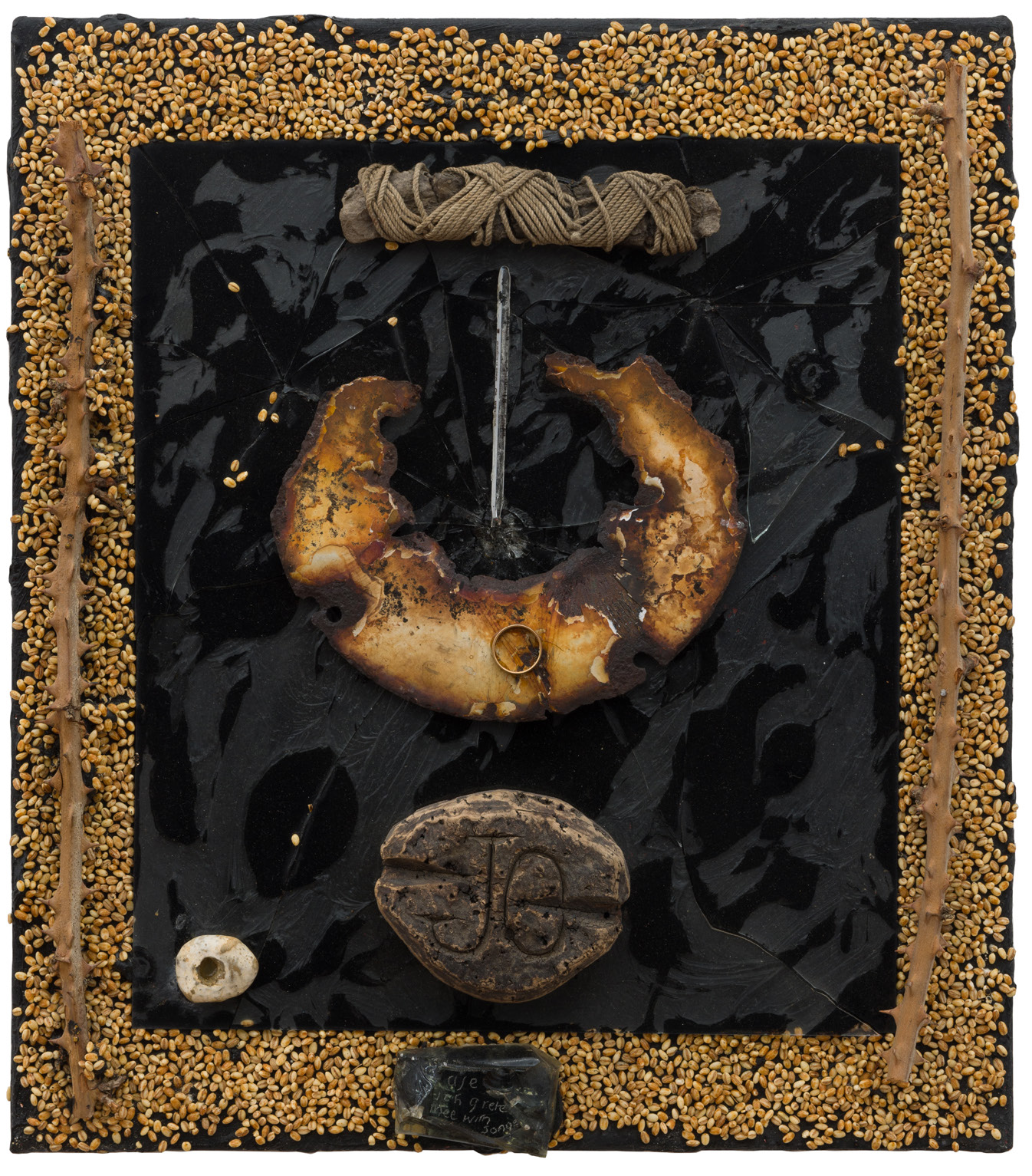 Ich grete thee with songe is part of Jarman’s black paintings series featuring found objects, often taken from the environment surrounding his beachside cottage in Dungeness, arranged in reliquary-like compositions on tar-black grounds. He often included “hag stones” in his black paintings, which were rocks with naturally forming holes with mystical properties and Celtic heritage. The “JC” carved on the hag stone double as Jesus Christ’s initials. The frame of seeds were seeds Jarman, an enthusiastic gardener, planted in his garden in Dungeness. Ich grete thee with songe translates to: “please accept my song even though I am an unworthy vessel.” Jarman was a reader of 17th century poetry, and had the lines of John Donne’s “The Sun Rising” inscribed on his cottage exterior.
