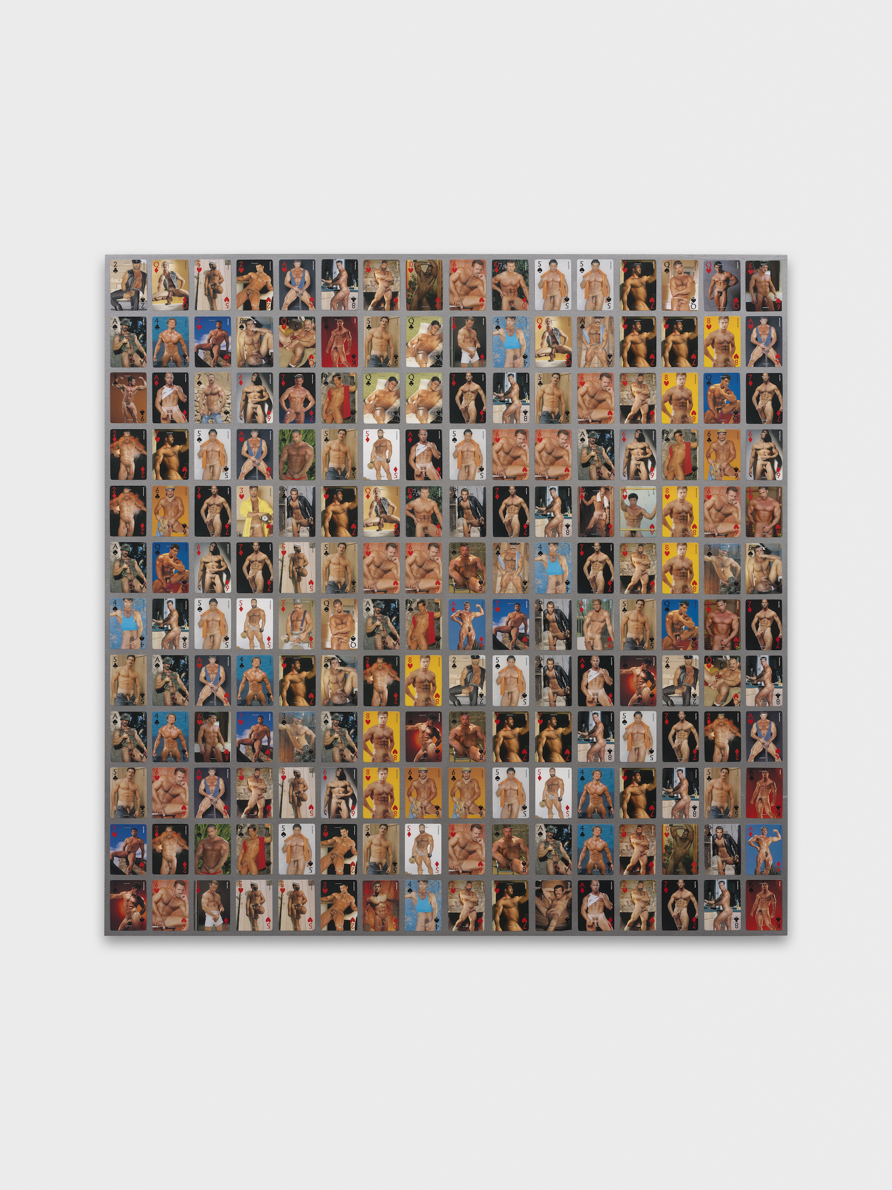 In Anderson’s playing card series, developed over the last decade, each letter of the alphabet is assigned to a specific type of card and spells out poems and other texts in a structured grid. Sonnet to Byron encodes a sonnet in tribute to Lord Byron by English Romantic poet John Keats using a combination of found gay porn playing cards from the late 90s and early 2000s. Keats dedicated several sonnets to fellow poets— such as Edmund Spenser, Thomas Chatterton, and Lord Byron—praising their literary talent and acknowledging their influence on his own work. Anderson identifies the homoerotic undertones within these tributes and reimagines the modernist grid, employing organization as an act of pleasure and order as a form of enjoyment. Anderson relinquishes control over the final composition to the structure of the sonnet itself, allowing the text to dictate the arrangement of the cards, similar to certain conceptual strategies of the 1970s (e.g. Boetti’s biro and arazzi works), but inflected with humor and based in a mass media, everyday reality.